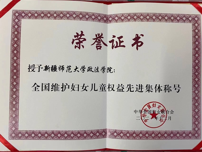 “全国妇女儿童权益先进集体”是由全国妇女联合会组织的对全心全意为妇女儿童服务,为促进男女平等、妇女全面发展、保障妇女儿童合法权益做出突出贡献的单位和个人给予的荣誉表彰。新疆维吾尔自治区共有20家单位获得先进集体荣誉称号,玩滚官网政法学院是唯一获得此荣誉的高校组织。