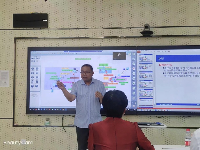 本场教学观摩课由第二届高校教师教学创新大赛新疆赛区副高组三等奖获得者赵新元副教授主讲。主要围绕“路由交换技术与应用”,采用翻转课堂+分组教学的方式,利用智慧教室现代教学技术,实现了学生分组讨论、实践操作、实验拓扑,不断加深学生对知识的理解、对技能的掌握和运用,充分实现了信息技术与课堂教学的深度融合,呈现了优良的教学效果。观摩课后,三位教学督导对赵新元副教授的教学进行了精彩点评,对课堂教学中多屏师生互动、分组任务驱动、“以学生为中心”的教学设计给予了充分肯定。专家认为,现代教育技术的运用对激发学生学习兴趣、增进课堂教学效果、提升课堂教学质量有重要意义,值得广大教师学习借鉴。