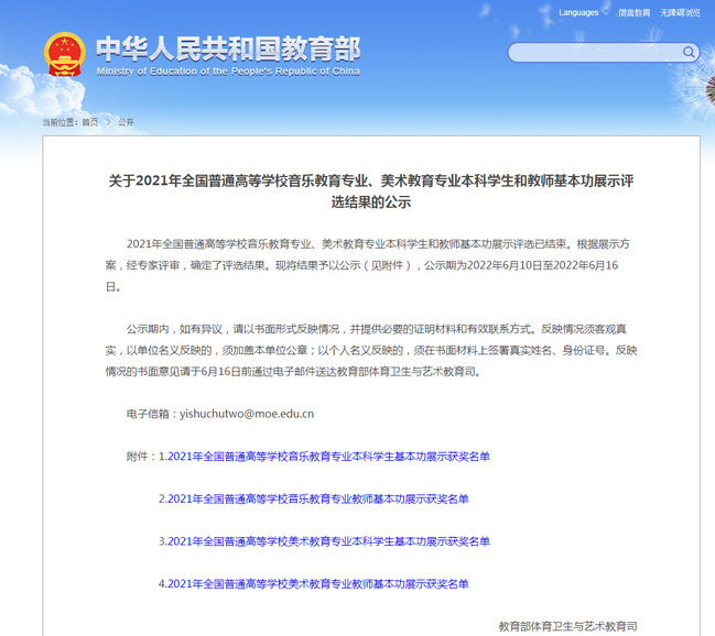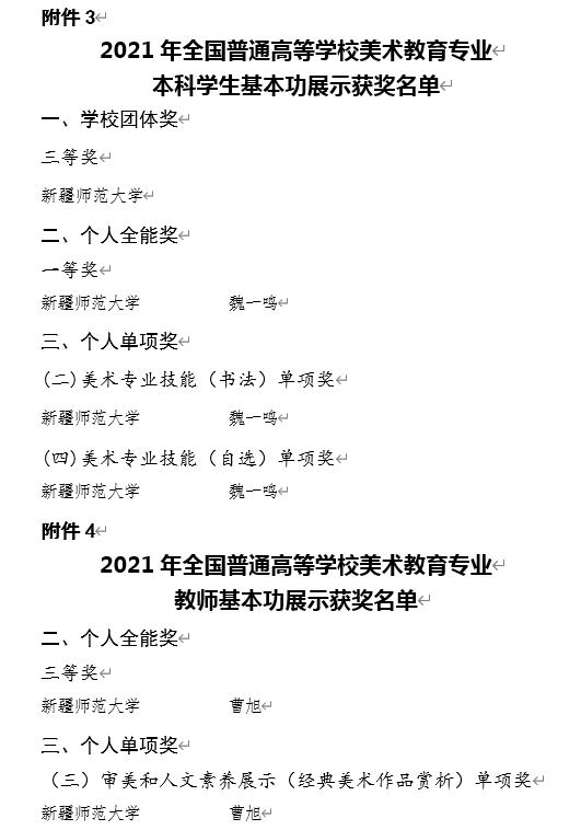 近日,教育部公布了2021年全国普通高等学校美术教育、音乐教育专业本科学生和教师基本功展示评选结果,玩滚官网师生在此次展示中再创佳绩,美术学院美术学2018级学生魏一鸣荣获个人全能一等奖、美术专业技能(书法)单项奖、美术专业技能(自选)单项奖;美术学院教师曹旭荣获个人全能三等奖、审美和人文素养展示(经典美术作品赏析)单项奖;音乐学院教师谢飞荣获个人全能三等奖、审美和审美和人文素养展示(经典音乐作品赏析)比赛单项奖。学校荣获“2021年全国普通高等学校美术教育专业本科学生基本功展示”团体三等奖。