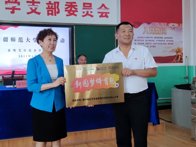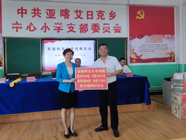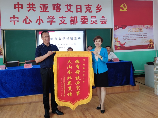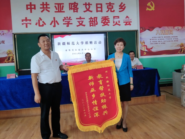 按照学校党委工作部署,为扎实推进对莎车县亚喀艾日克乡中心小学的教育帮扶工作,改善其办学条件、优化教学管理体制机制、提高办学质量和办学水平,6月17日,玩滚官网向亚喀艾日克乡中心小学捐赠仪式在乡中心小学举行。校党委常委、副校长、驻莎车县前方党工委书记孙秀玲出席捐赠仪式并讲话,莎车县委常委、宣传部部长、教育工委书记陈保云,莎车县教育局党委书记、副局长陈海洋,亚喀艾日克乡党委书记梁秀超,亚喀艾日克乡中心小学党支部书记马建刚,校长吐尔洪江·图尔孙,莎车县教育局干部、附属中学送教教师和部分工作队队员等参加仪式。捐赠仪式由吐尔洪江·图尔孙主持。