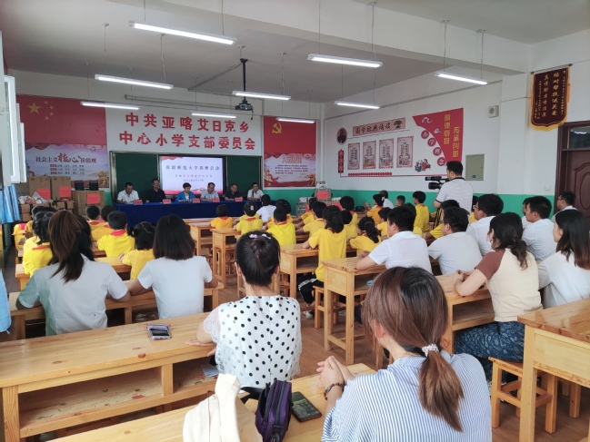 孙秀玲在讲话中说,自2021年3月起,学校开启助力亚喀艾日克乡教育教学工作,学校党委充分依托学校教育优势,在帮扶内容、帮扶机制上做好顶层设计,把对亚乡小学的帮扶作为“访惠聚”工作的重要任务,通过派驻经验丰富的管理干部、骨干教师和实习支教学生,充实优化教师队伍,提升办学水平;通过开展“双师课堂”,创新教学模式,安装专网并购置平板电脑,做好教学保障工作;开展假期“小课堂”、组织夏令营活动等,提高亚乡小学教育教学质量;制定《中华优秀传统文化进校园实施方案》,深入推进文化润疆工作落实落小,铸牢中华民族共同体意识,已初步形成“日常教学+周末小课堂+假期小课堂+夏令营”的教育帮扶模式。为改变亚乡小学办学条件和学习条件,学校用全体党员捐款形成的“初心基金”连续两年向亚乡小学捐赠包括图书、教学设备等,充分体现了新疆师大党委和全体教职工们对亚乡孩子们的关心关爱,也是师大人教育情怀和社会责任的具体体现。