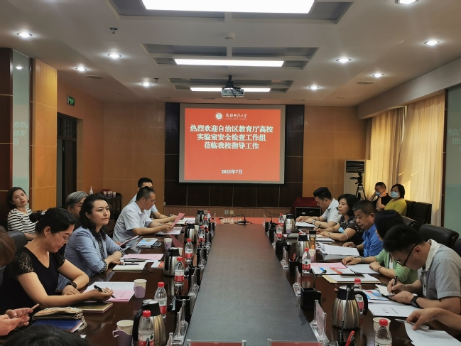 会上,陈勤代表检查组从高校实验室安全检查目的、意义、组织纪律和检查流程等方面提出要求。帕力旦·吐尔逊代表学校党委对自治区教育厅检查组莅临玩滚官网指导工作表示欢迎,强调了学校高度重视实验室安全,大力推进实验室建设,取得了突破性进展,希望通过检查组进校指导,全面提升玩滚官网实验室安全管理水平,切实维护校园安全稳定和师生生命财产安全,以实际行动迎接党的二十大的召开。李进从学校基本情况、实验室安全责任体系与规章制度建设、实验室安全教育、实验室安全隐患排查与整改落实情况、特色工作、存在问题等方面进行了工作汇报。