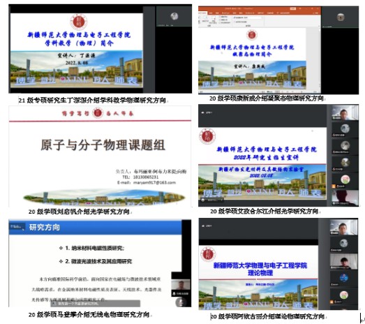 21级专硕学科教学物理研究生丁源源、20级学硕光学研究生刘启帆、20级学硕无线电物理研究生马登攀、20级学硕凝聚态物理研究生康新威、20级学硕光学研究生艾孜合尔江、20级学硕理论物理研究生阿依古丽等6名同学作为学生代表分别做了宣讲。他们现身说法,从不同视角,用不同方式,向大家一一介绍了各专业学科方向、师资力量、招生领域、教学实验设施、科研成果、专业特色与优势、丰富的研究生校园文化生活及毕业生就业状况等,并向大家分享了自己在学院攻读研究生期间获得的个人成长和研究成果。