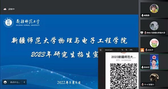 为帮助更多学生了解物理与电子工程学院研究生招生方向和特色优势,吸引更多优秀生源报考,提高研究生生源质量和规模,8月8日,物理与电子工程学院组织开展研究生线上招生宣传活动。活动由物理与电子工程学院副院长戴鹏鹏主持,院领导班子、各专业系部负责人、学院2023届毕业班学业班主任、毕业生及来自吉林通化师范学院、喀什大学、伊犁师范大学等有报考意愿的学生共计120余人参加了此次活动。