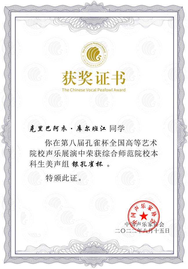 8月9日至15日,第八届孔雀杯高等艺术院校声乐展演在宁波大学举行。经过为期一周的激烈角逐,玩滚官网音乐学院2018级本科生克里巴阿衣·库尔班江荣获综合师范类院校本科美声组银奖,2018级本科生杨明辉、2019级本科生后腾荣获优秀奖,声乐教研室主任王丛获得银孔雀优秀指导教师奖。