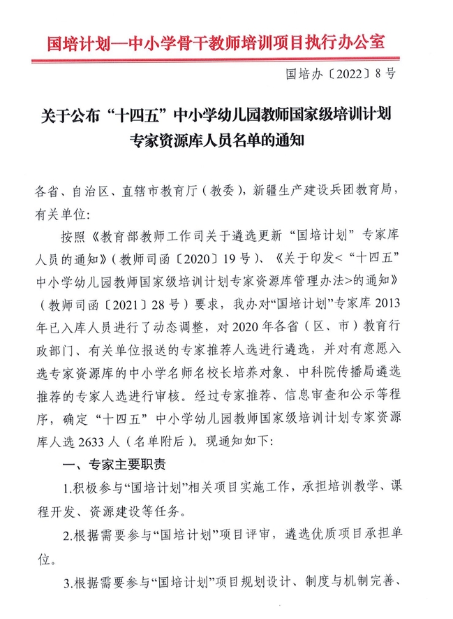 据悉,为贯彻落实《中共中央国务院关于全面深化新时代教师队伍建设改革的意见》,加强教师培训者队伍建设,支持“十四五”时期“国培计划”高质量实施,按照《“十四五”中小学幼儿园教师国家级培训计划专家资源管理办法》,教育部依托“国培计划”—中小学骨干教师培训项目执行办公室开展了“十四五”中小学幼儿园教师国家级培训计划专家资源库人员遴选更新工作。前期,经个人申报、学院推荐、学校审核等程序,学校“国培计划”项目办上报了推荐人选名单,并全部成功入选。