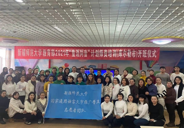 国家语言文字基地顺利实施教育部“童语同音”计划师资培训。2021年12月起,基地组织了一支由语言文字、语言教学、语言科技、学前教育专家组成的教学团队,赴伊犁州伊宁县、塔城地区托里县、巴州库尔勒市、焉耆回族自治县、吐鲁番市高昌区、哈密市伊州区6地为600名幼儿园教师进行国家通用语言培训,得到受训单位和学员的高度肯定,相关通讯5次被教育部“推普助力乡村振兴”官方微信公众号转载。培训效果良好,社会反响热烈。