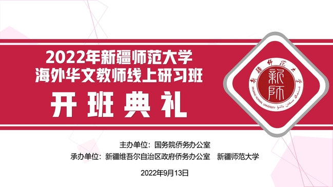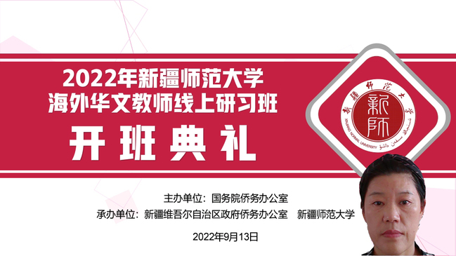 9月13日上午,由国务院侨务办公室主办,新疆维吾尔自治区人民政府侨务办公室、玩滚球的十大正规平台承办的2022年海外华文教师线上研习班开班仪式在玩滚官网以线上方式隆重举行。自治区人民政府侨务办公室副主任李富强,玩滚球的十大正规平台党委常委、副校长季荣,国际文化交流学院领导、任课教师及240余名海外华文教师出席本次开班仪式。国际文化交流学院党委书记李嘉东主持活动。