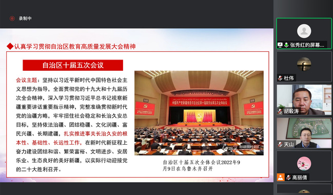 本次主题党日活动由机关党委书记张秀红主持。活动中,支部全体党员观看了《新疆新闻联播:自治区教育高质量发展大会召开》。随后张秀红为党员们讲授题为《认真学习贯彻自治区教育高质量发展大会精神》微党课,从总体要求、发展目标、建设内容和保障措施四个方面,为党员们解读了自治区教育高质量发展大会精神的核心要义和具体内容,介绍了学校积极组织学习贯彻自治区教育高质量发展大会精神,切实发挥铸牢中华民族共同体意识主阵地作用的工作思路和主要举措。研讨交流环节,支部党员茹利涛在发言中谈到:“做好教育工作是事关新疆社会稳定和长治久安的根本性、基础性、长远性工作,要把大会精神与学校1+3+3重点工作结合起来,从中把握今后的工作方向和重点,进一步深化对教育工作重要性的认识”。支部党员杨艺认为,作为机关干部,要时刻牢记党对教育工作的全面领导,切实把思想和行动统一到党中央决策部署、自治区党委工作要求和学校党委的具体安排上来,求真务实、担当作为,为开创新疆教育高质量发展新局面发挥自己的作用。