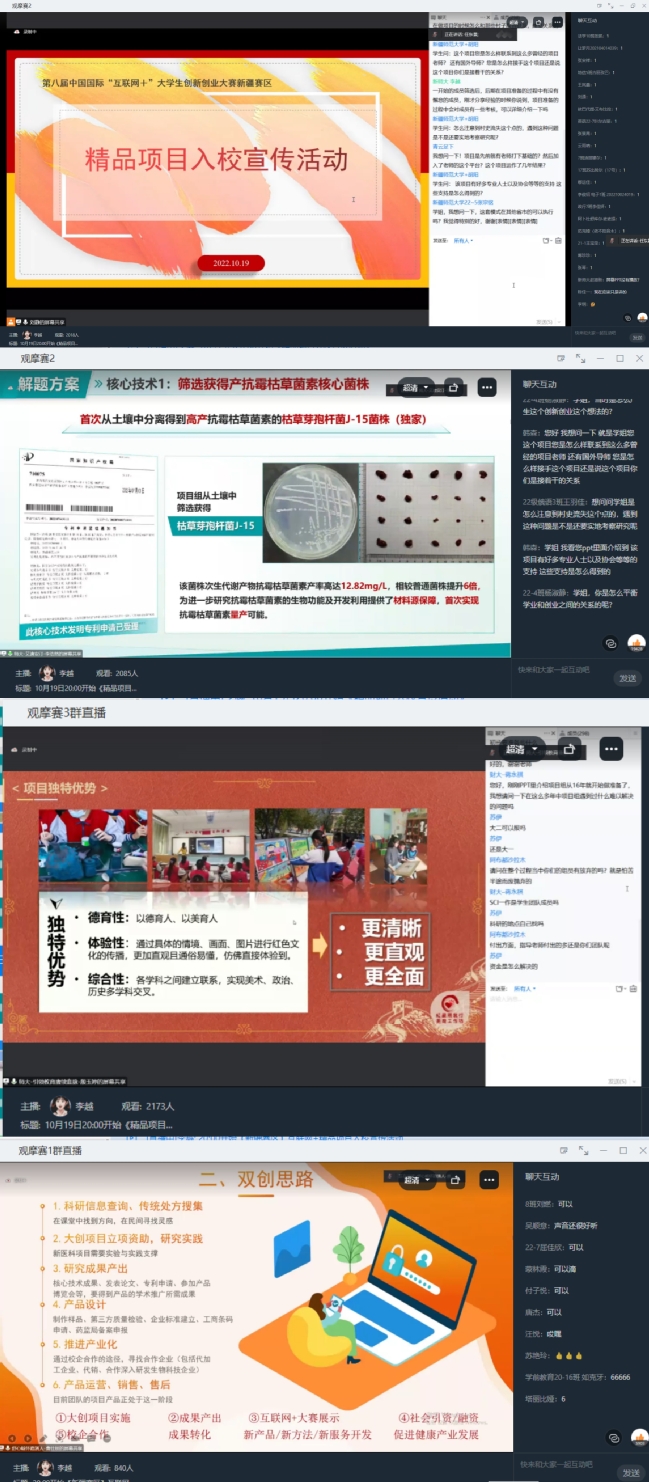 第八届中国国际“互联网+”大学生创新创业大赛新疆赛区选拔赛已圆满结束,自治区教育厅会同区赛组委会从本届参赛项目中遴选出了15项精品项目,在新疆教育厅网站和新疆大学生创新创业网站开设专栏进行线上宣传活动。玩滚官网高度重视,积极响应,根据自治区教育厅工作安排,于10月17日至26日期间,由教务处协同各学院组织师生5000人次参加了五场精品项目线上宣传活动。