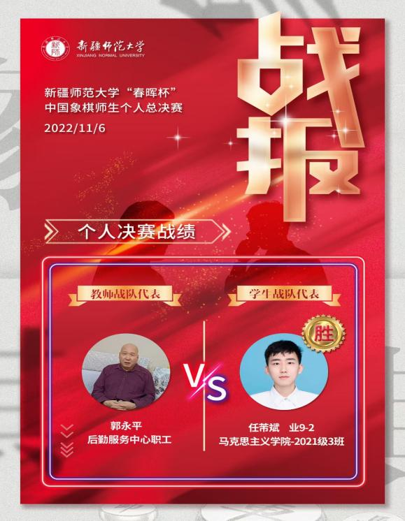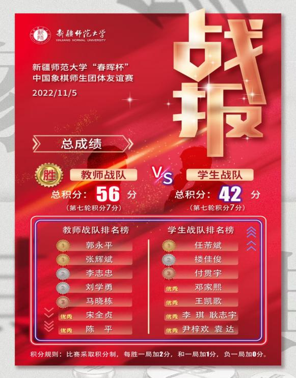 本次比赛本着“切磋棋艺,以棋会友”的宗旨,秉承“友谊第一,比赛第二”的原则进行。第一局学生战队执红棋先行,对弈中教师战队以6分优势夺得比赛先机;第二局至第七局学生战队奋起追击,双方步步紧逼,硝烟四起,经过一番鏖战,最终教师战队以总积分56分胜出,学生战队以42分惜败。根据师生积分排名情况,由积分最多的郭永平老师和任芾斌同学再进行三番棋(三局两胜)个人决赛。本场对局双方在经过第一局23回合、第二局60回合后,最终在第二局执红棋的任芾斌同学凭借“海底捞月”绝杀黑棋,取得胜利,获评最佳棋手。