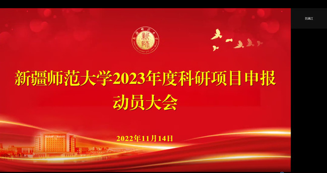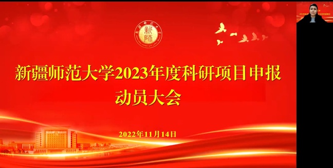 为进一步提升玩滚官网2023年度科研项目申报工作质量,激发广大教师申报各级各类科研项目热情,11月14日,玩滚官网2023年度科研项目申报动员大会在线上召开。校党委副书记、校长吾满江·艾力,校党委常委、副校长帕力旦·吐尔逊出席会议,各学院书记、院长、分管科研工作副院长及教师代表参会。
