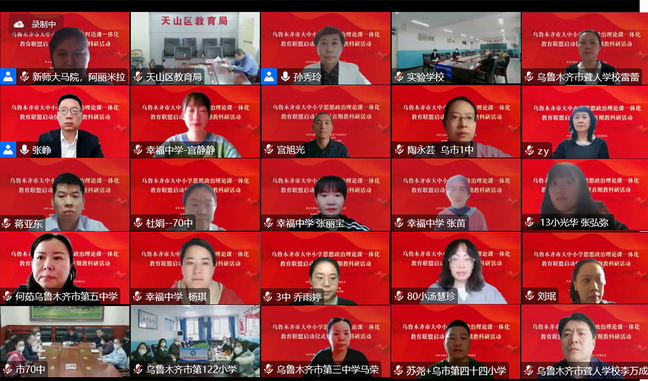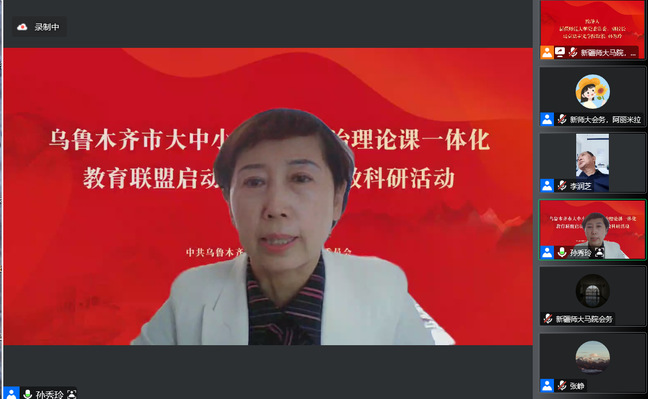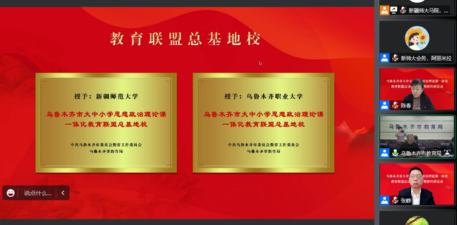 为深入贯彻落实习近平总书记关于办好思政课相关重要指示批示精神,贯彻落实《关于深化新时代学校思想政治理论课改革创新的若干意见》等文件要求,坚持不懈用习近平新时代中国特色社会主义思想铸魂育人,推进大中小学思政课一体化建设,由乌鲁木齐市委教育工委、市教育局、玩滚球的十大正规平台马克思主义学院、乌鲁木齐职业大学马克思主义学院及全市48所中小学幼儿园共同组建了乌鲁木齐市大中小学思想政治理论课一体化教育联盟。12月7日下午,联盟启动仪式暨首期教科研活动以线上会议方式举行。自治区人民政府督学、自治区教育厅一级巡视员韩春玺出席启动仪式并讲话。玩滚球的十大正规平台党委常委、副校长、马克思主义学院院长孙秀玲,乌鲁木齐职业大学党委委员、副校长李润芝,乌鲁木齐市委教育工委副书记、教育局党组书记张瑛分别致辞。来自乌鲁木齐教育系统600余名思政工作者、教师参加仪式。仪式由玩滚球的十大正规平台马克思主义学院党委书记张峥主持。
