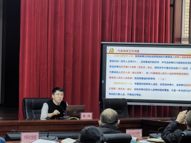 校党委常委、组织部部长胡毅涛对第三次党代会动员暨代表选举工作提出了具体要求。组织部工作人员随后对参会的全校各二级党委(党总支)书记、组织员、党支部书记开展了相关工作培训。