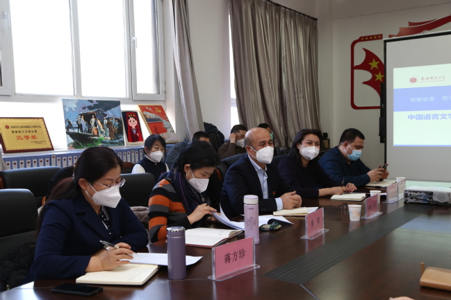 1月6日下午,校党委副书记、校长吾满江·艾力,党委常委、副校长帕力旦·吐尔逊,党委常委、副校长季荣,党委常委、纪委书记蒋方珍一行到中国语言文学学院走访调研指导工作,党委办公室副主任、学校办公室副主任阿布都如·苏力,学生就业指导办公室主任熊文红,科研处副处长苏闻宇,教务处副处长姜玉琴,研究生处管理科科长王顺达等陪同调研。
