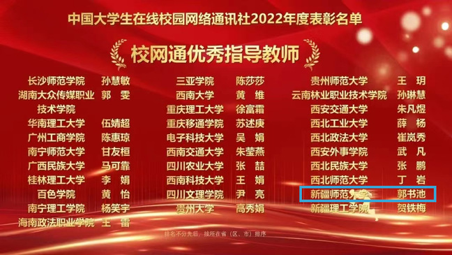 学生工作部(处)教师郭书池获评“校网通优秀指导教师”(全国共90名教师获得)、“校园新媒体创新应用奖”(全国共25名教师获得)