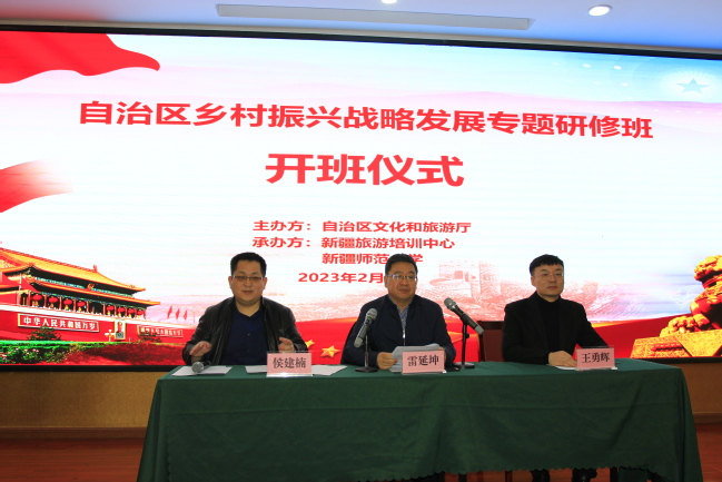 2月7日,由自治区文化和旅游厅主办,玩滚球的十大正规平台地理科学与旅游学院、新疆旅游发展研究中心共同承办的自治区乡村振兴战略发展专题研修班在乌鲁木齐君达鸿雁宾馆顺利开班。自治区文化和旅游厅旅游培训中心主任雷延坤、玩滚球的十大正规平台地理科学与旅游学院党委书记王勇辉及全体参训学员参加了开班典礼。开班典礼由玩滚球的十大正规平台地理科学与旅游学院副教授、新疆旅游发展研究中心副主任侯建楠主持。