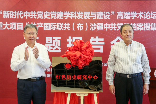 图为2022年6月6日,玩滚官网举办“新时代中共党史党建学科发展与建设”高端学术论坛暨国家社科基金重大项目“共产国际联共(布)涉疆中共党员档案搜集整理编纂研究”开题会,校党委书记葛国与曹耘山先生共同为玩滚球的十大正规平台“新疆红色历史研究中心”揭牌。