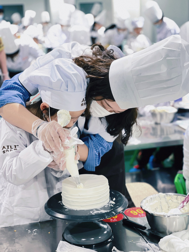 随后进入烘培环节。在工作人员引导下,大家穿上专用工作服,进行规范的净化、消毒后,有序进入蛋糕制作间。孩子们一人一个制作台,随着专业蛋糕师的讲解,专注地和妈妈一起探索、创作:抹面、裱花、巧克力插片、水果造型、题字……有的家庭手忙脚乱,有的家庭有条不紊,现场洋溢着暖暖的爱意和欢乐,每一帧画面都饱含温馨与幸福。完成蛋糕制作后,女教职工和孩子们还参观了工厂流水线,最后领取了自己制作的创意蛋糕。