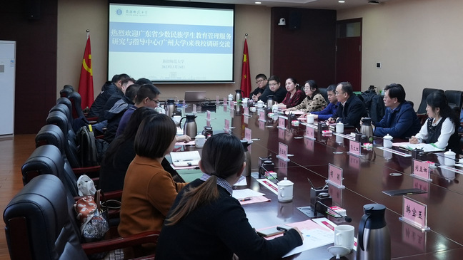 3月24日上午,广东省少数民族学生教育管理服务研究与指导中心(广州大学)学生处(学生工作部)副处(部)长吴锋刚、少数民族学生工作办公室副主任蔡强一行9人来玩滚官网调研交流。校党委书记葛国、党委副书记刘俊出席座谈会,学生工作部(处)、学生就业指导办公室以及相关学院副书记和辅导员代表参加座谈。座谈会由校党委常委、宣传部部长高靖主持。