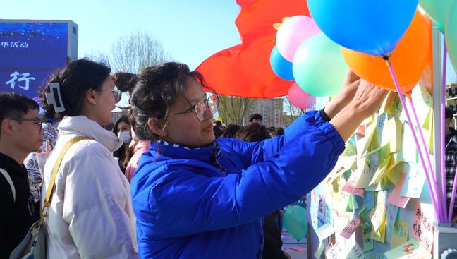 活动开始前,参加活动师生纷纷聚集到签到墙,领取祝福嘉年华卡片。心理学院专业教师和部分学生带领全场师生做集体拍拍操,掀起活动热潮。