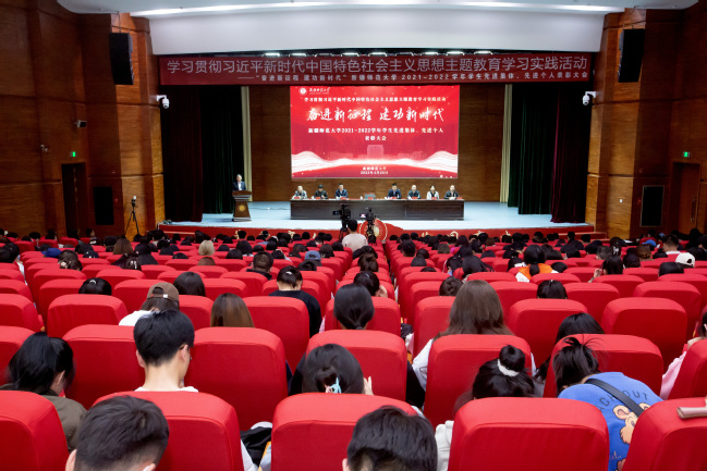 新师学子奖章获奖代表马克思主义学院高也茜、“三强班级”获奖代表音乐学院丁文静、心理健康工作先进个人地理科学与旅游学院周洁、第八届“互联网+”大学生创新创业大赛获奖代表计算机科学学院刘滢在会上发言。