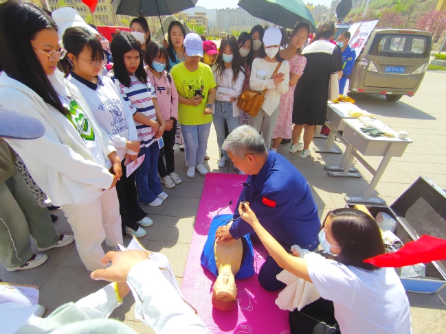 在图书馆门前的小广场,室外科普宣传活动也在如火如荼地进行。新疆蓝天救援队队员现场开展防震避灾、火灾险情逃生技能、紧急心肺复苏抢救、急救包扎术等应急避险自救技巧;国防办及新疆人防协会展示及演示国防人防展板、人防标识标牌实物、消防器材实物,并向师生发放300余份《国防动员宣传手册》及《防灾减灾宣传手册》;新疆消防协会搭起模拟火灾逃生体验屋,师生积极参与,体验在实景中遇火灾时如何正确逃生。