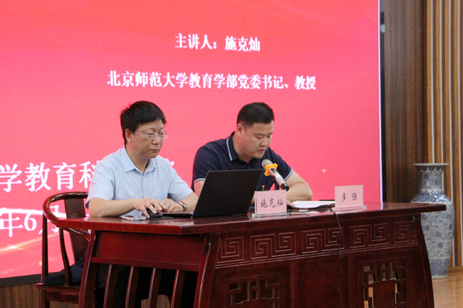 为深入开展学习贯彻习近平新时代中国特色社会主义思想主题教育,学习贯彻习近平总书记关于弘扬中华优秀传统文化的重要论述,加强师生党员对中华优秀传统文化的理解,6月1日,教育科学学院党委、继续教育学院党总支邀请北京师范大学教育学部党委联合开展主题教育读书活动。北京师范大学教育学部党委书记施克灿教授、副书记阚维副教授、副书记刘立、副部长余凯教授、副部长王晨教授、党政办主任丁秋祎及玩滚官网教育科学学院、继续教育学院领导班子成员和教师党员、研究生党员参加活动。读书活动由北京师范大学教育学部党委书记施克灿教授主讲,玩滚官网教育科学学院党委书记多强教授主持,院长程良宏教授总结。