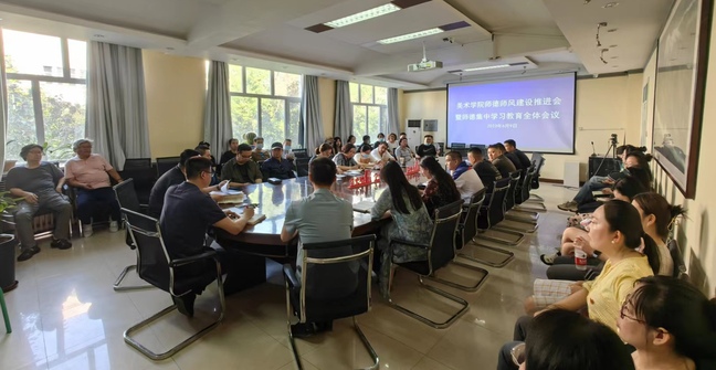 为进一步深化学习贯彻习近平新时代中国特色社会主义思想主题教育,落实学校师德师风建设工作推进暨师德集中学习教育启动部署会精神,6月9日,美术学院召开师德师风建设推进暨师德集中学习教育会议。会议由美术学院党委副书记、院长李勇主持,学院全体教师参会。