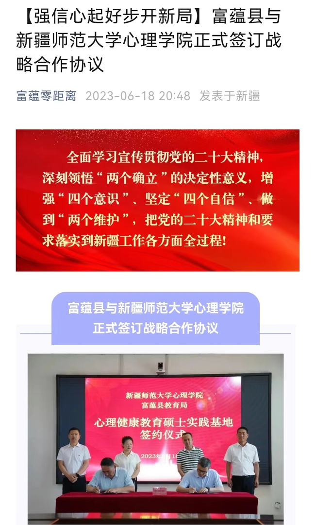 6月15日至18日,玩滚官网心理学院副院长、新疆心理学会秘书长刘毅带领团队一行四人赴富蕴县,开展为期五天的教育卫生系统心理健康教育调研工作,同时分别在县教育局、卫健委授牌成立“玩滚球的十大正规平台心理学院心理健康教育硕士实践基地”“玩滚球的十大正规平台心理学专业实践基地”,并签订战略合作协议。富蕴县政府副县长王庆国、卡玛西·马木尔别克出席授牌仪式并代表卫生教育系统讲话。