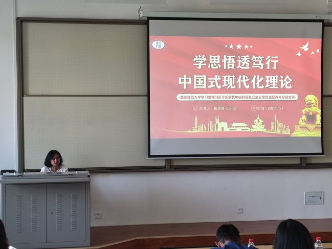 为深入开展学习贯彻习近平新时代中国特色社会主义思想主题教育,落实学校党委关于主题教育的整体部署,6月27日下午,校党委常委、副校长帕提曼·吐尔逊在温泉校区1号教学楼101教室为后勤服务中心党员干部讲授题为《学思悟透笃行中国式现代化理论》的主题教育专题党课,覆盖党员50余人次。