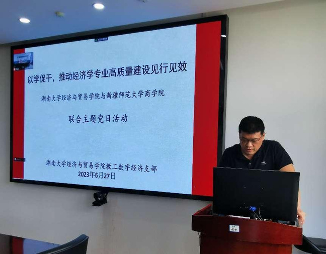 为进一步提升学习贯彻习近平新时代中国特色社会主义思想主题教育成效,创新学习形式,推动院际合作走深走实,6月27日下午,商学院教师党支部与湖南大学经济与贸易学院教工数字经济党支部以视频连线方式共同开展“以学促干,推动经济学专业高质量建设见行见效”联合主题党日活动。