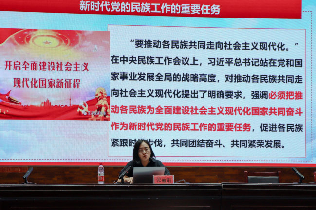开班仪式后,玩滚官网马克思主义学院党委副书记、院长张丽娟以铸牢中华民族共同体意识、汇聚起中华民族团结奋斗的磅礴伟力为主题进行专题教学。