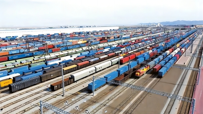 新疆加快丝绸之路经济带核心区建设,着力打造向西开放的桥头堡。图为2023年5月25日,阿拉山口站编组场内出入境中欧班列及其他货运列车正集结待发(无人机拍摄)。 新疆维吾尔自治区党委宣传部供图