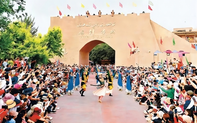 进入夏季以来,新疆各地纷纷推出“引客入疆”优惠政策,激发文旅市场消费潜力。图为2023年6月18日,游客在喀什古城景区东门观看开城仪式。 新疆维吾尔自治区党委宣传部供图