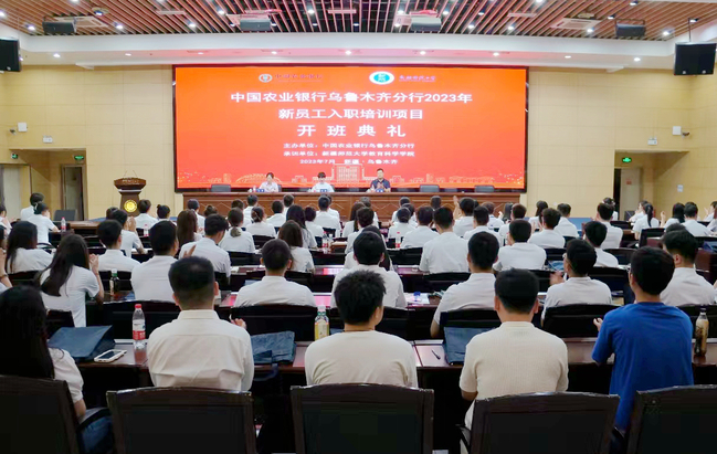 为进一步推进落实学校与中国农业银行乌鲁木齐分行签订的党建共建协议,按照“资源共享、优势互补、注重实效、共同提高”的原则,通过搭建活动平台、分享工作资源、解决实际问题等方式,不断探索校企合作新模式,受中国农业银行乌鲁木齐分行委托,由玩滚官网教育科学学院承办“中国农业银行乌鲁木齐分行2023年新员工入职培训项目”于7月22日在玩滚官网昆仑校区国际教育大厦一楼报告厅顺利开班。开班典礼由中国农业银行乌鲁木齐分行人力资源部汪莹主持,该行共94名新入职员工参加。