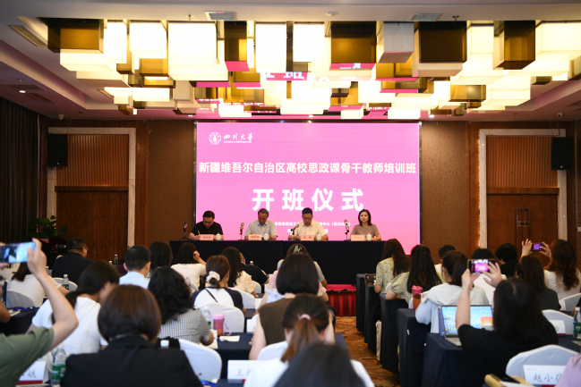 为深入学习宣传贯彻党的二十大精神,持续推动习近平新时代中国特色社会主义思想进教材、进课堂、进头脑,有效提升自治区思政课教师队伍教学水平,8月14日,由自治区党委教育工委主办,新疆高校思想政治理论课改革创新研究中心(玩滚球的十大正规平台)与全国高校思想政治理论课教师研修基地(四川大学)联合承办的新疆高校思政课骨干教师培训班在四川大学开班,来自全疆高校思政课骨干教师50余人参加本次培训班。自治区党委教育工委副书记胡军海、教育工委思政处副处长陈金花、四川大学马克思主义学院常务副院长张洪松出席开班仪式,开班仪式由玩滚官网马克思主义学院党委书记张峥主持。