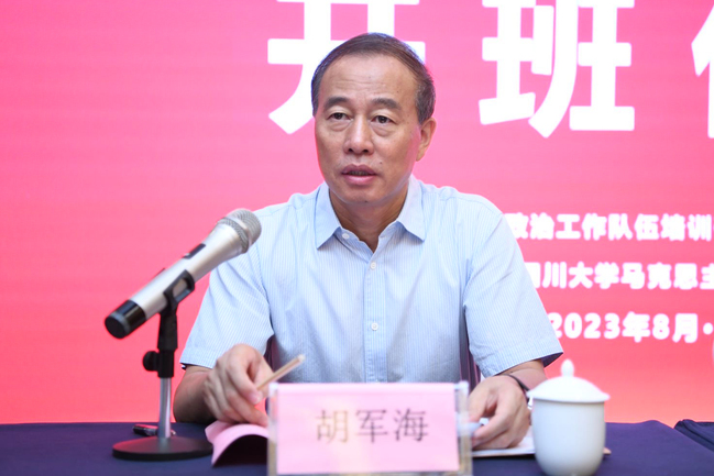 胡军海在讲话中表示,本次培训班旨在持续推动习近平新时代中国特色社会主义思想进教材、进课堂、进头脑,进一步提升高校思政课教师队伍的政治能力、思维能力、实践能力,探索思政课教育教学的新形式和新载体,推动思政课改革创新。胡军海向全体培训教师提出三点要求,一要提高政治站位,切实增强做思政课教师的使命感和责任感,争做“六要”的好老师、大先生;二要着力提升素养,在守正创新中构建立德树人新格局,不断提升思政课针对性和吸引力,促进思政课有高度有深度有温度,有形有感有效;三要严格纪律要求,确保培训工作取得扎实成效。思政课教师要锤炼过硬本领,在守正创新中构建立德树人新格局,着力强化政治能力、思维能力和业务能力,坚持不懈用习近平新时代中国特色社会主义思想凝心铸魂,不断提高思政课建设水平,提升人才培养质量,推动新疆教育高质量发展。