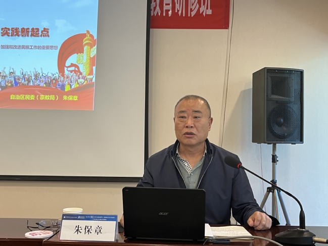 开班仪式结束后,由自治区民委原副巡视员朱保章作《深刻领会习近平总书记关于加强和改进民族工作的重要思想》的首场专题讲座。