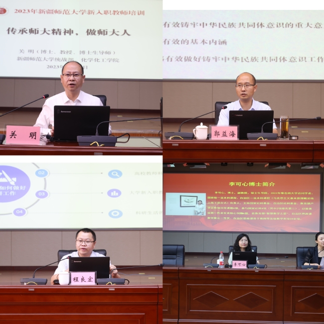入职教育中,校党委常委、统战部部长关明教授结合自身学习发展经历,以《传承师大精神·做师大人》为题,与新教师分享为人、为师、为学的体会和感悟,激励新教师深耕不辍、担当使命,在为学校事业发展贡献力量的同时,实现“育人育己、成人成己”。自治区党校郭益海教授以《有形有感有效做好铸牢中华民族共同体意识工作》为题,教育引导新教师坚持把立德树人作为中心环节,把思想政治教育工作贯穿教育教学全过程,将铸牢中华民族共同体意识融入教书育人全过程,推动各民族师生广泛交往、全面交流、深度交融。“新师学者”、教育科学学院院长程良宏教授以《诚信为基——新教师如何做好科研工作》为题,结合自身教学科研经历,向新教师阐明高校教师提升科研素养和科研能力的基本路径,在教育教学中培育新时代大学教师的学术责任和精神。玩滚官网青年拔尖人才、马克思主义学院李可心副教授以《智慧教学赋能新师育人——基于国家级一流课程设计的思考》为题,以自身主持建设的国家一流课程《马克思主义基本原理概论》为例,解析线上线下融合学习与教学特点、设计原则与方法,阐释信息技术与教学深度融合的路径,鼓励新教师积极参与教学创新并有效融入课程思政。