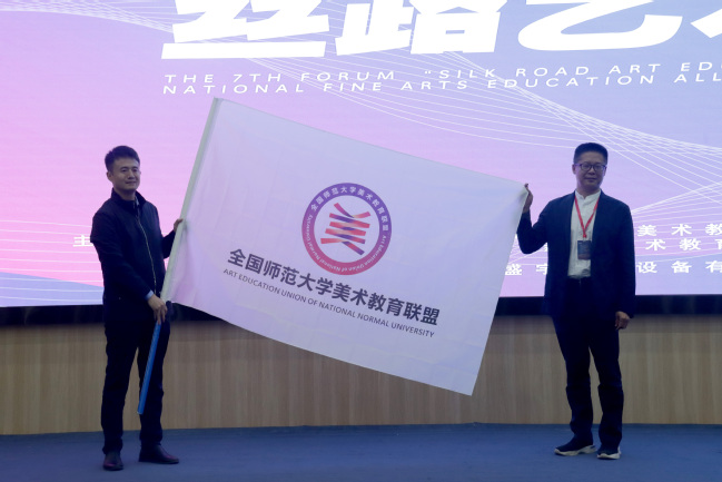华中师范大学作为第八届全国师范大学美术教育联盟论坛的主办单位,与玩滚球的十大正规平台进行了交接旗仪式。