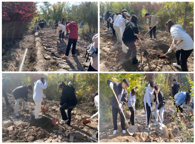在农场工作人员的指导下,劳动实践正式拉开序幕。同学们拿上劳动工具,戴上手套,分别在各自的责任区域里开展翻地整地、清理杂草、石砖移挪等劳作。历经数小时的努力,47名学生全部完成了劳动任务,为农场的环境做出了青春贡献。在劳动中,同学们纷纷表示,能在双节期间参加这样的劳动活动感到收获颇多,不仅学会了正确的农务知识,了解了种植技巧等,还在劳动中加深了彼此间的了解,升温了学生情谊。