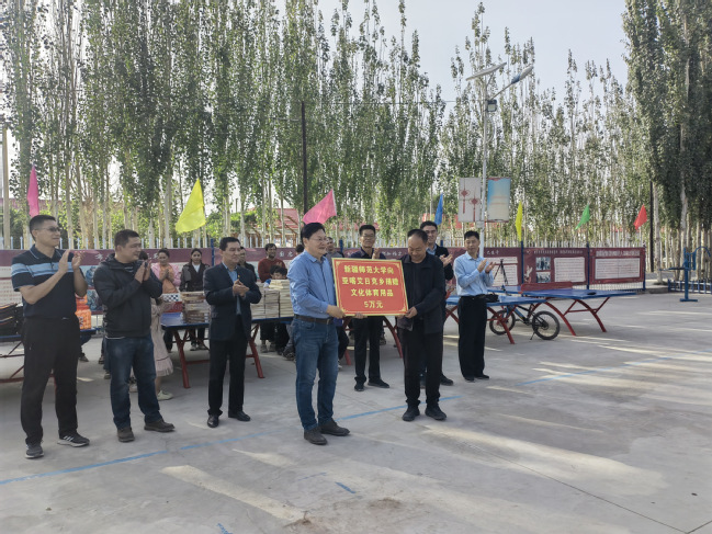 校党委常委、宣传部部长高靖出席捐赠仪式并发表讲话,他代表玩滚球的十大正规平台党委向亚喀艾日克乡捐赠价值5万元的文体用品,包括乒乓球桌20张,乒乓球拍100副,中国象棋100副,国际象棋100副等。高靖指出,文化振兴是乡村振兴的灵魂,学校党委高度重视,在驻村工作中以文化润疆活动为切入点,不断提升村民文化认同,有助于涵养向上向善的文化风尚,赋予乡村文明新的时代内涵,铸牢中华民族共同体意识。