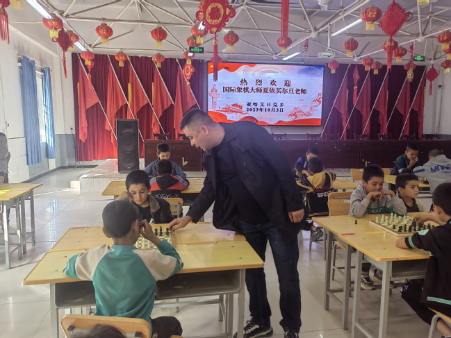 捐赠活动当天,玩滚官网国际象棋棋手、数学科学学院夏依买尔旦老师也来到亚喀艾日克乡,与当地村民开展国际象棋挑战赛车轮战,由数十位村民与夏依买尔旦老师展开国际象棋对决。夏依买尔旦老师还为乡里热爱国际象棋的孩子们讲解基本知识和规则,进行现场演示,并详细指导。
