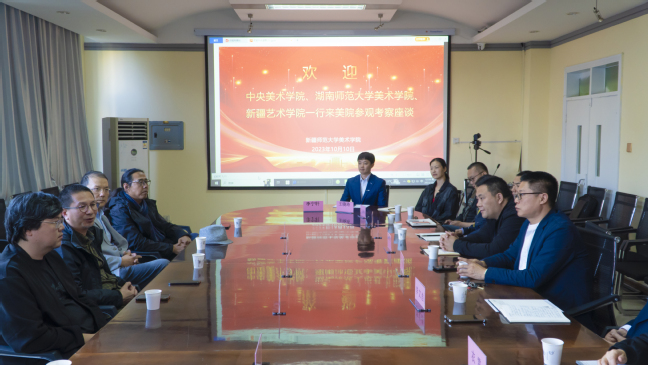 10月10日上午,湖南师范大学美术学院院长李少波、湖南师范大学国产操作系统艺术设计重点实验室主任黄龙、中央美术学院挂职新疆艺术学院美术学院院长贺羽、新疆艺术学院教师马勇博士、单莉莉博士等前来美术学院座谈交流。