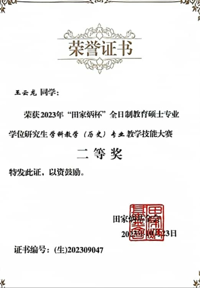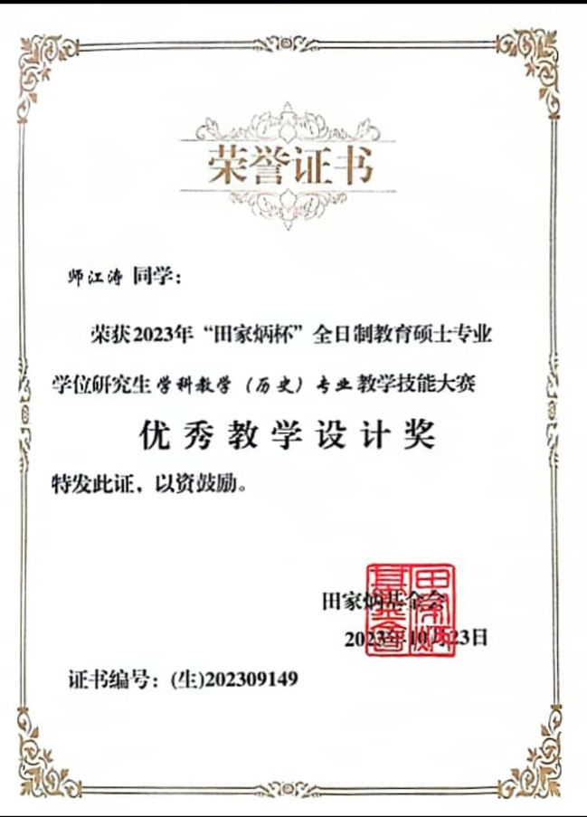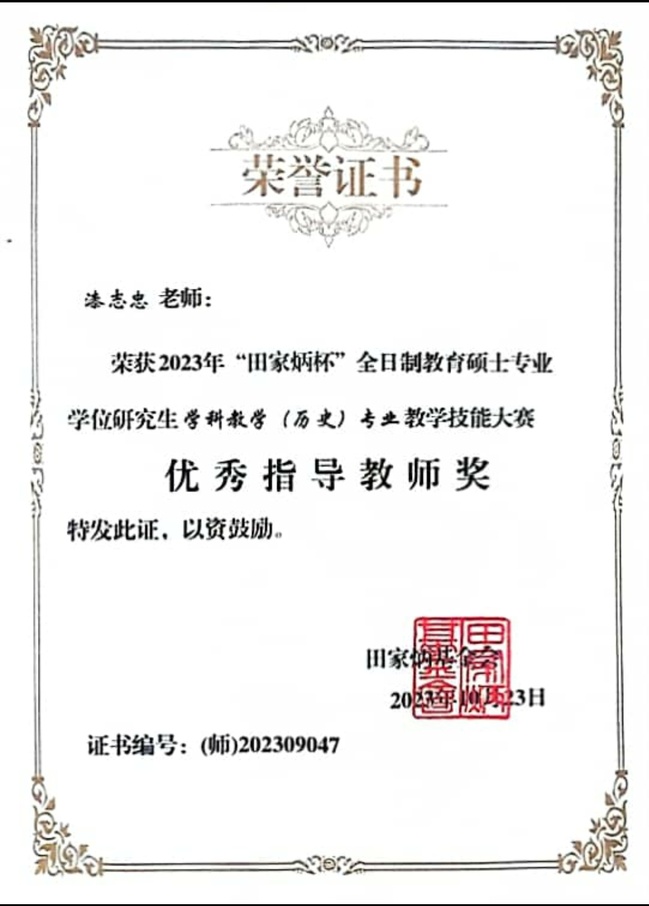 10月23日,2023年全国“田家炳杯”全日制教育硕士专业学位研究生学科教学(历史)教学技能大赛决赛在成都圆满落下帷幕。历史与社会学院教师漆志忠、王振娜带队参加比赛。经过激烈角逐,研究生王云龙、师江涛分获二等奖和优秀教学设计奖,漆志忠教授荣获大赛“优秀指导教师”称号。