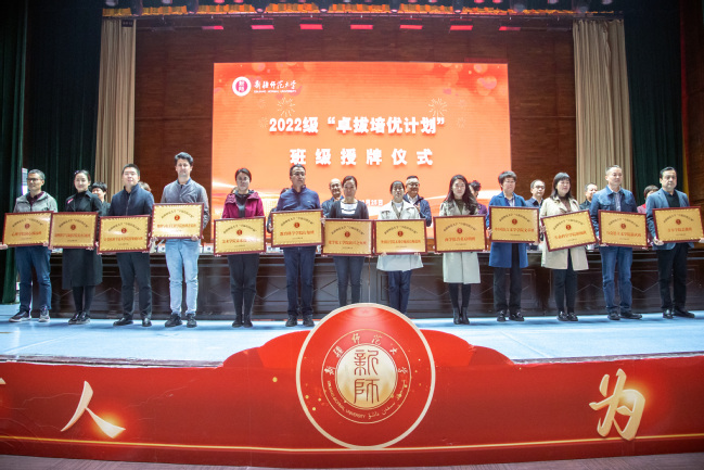随后,与会领导及嘉宾为玩滚官网13个试点学院的卓拔培优班级进行授牌。教育科学学院教育管理专业学术带头人、国家级一流课程主持人、硕士研究生导师热孜万古丽·阿巴斯副教授作为导师代表发言,化学化工学院化学工程与工艺21-5班史妍洁作为学生代表发言。