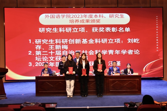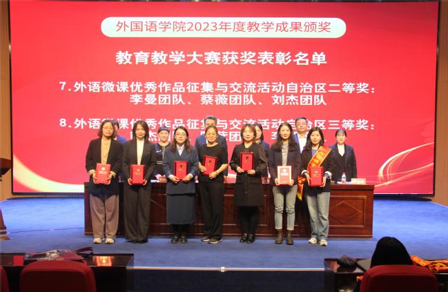 大会对2023年省部级及以上教科研立项,省部级及以上教学比赛获奖、学科竞赛优秀指导教师奖的25名教师,以及省部级及以上学科竞赛获奖、研究生科研创新基金项目立项、创新创业项目立项的16名学生进行了表彰。学院青年教师英语专业吴曦、日语专业张腾飞,及翻译硕士专业2022级俄语笔译研究生程一鸣作为获奖师生代表发言。