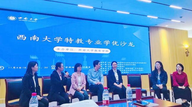 本次年会共设置五个分论坛,分别是特殊教育教育专业建设、融合教育发展、特殊教育课程与教学、特殊儿童教育康复及特殊教育师资队伍建设。教育科学学院张玉红和王春晖老师在第四论坛分别以《听障青少年社会情感能力的类别表征:基于潜在剖面分析》《特殊儿童行为问题潜剖面分析》为题作报告,高宇翔老师以《负重前行:乡村随班就读教师生存状态的个案研究》为题在第五论坛作报告。三位教师分别就各自研究领域与参会代表进行交流研讨。张香玉老师参加了西南大学特殊教育学院举行的“学优沙龙”活动并作交流发言,就西南大学特殊教育专业学子提出的问题进行了现场解答。