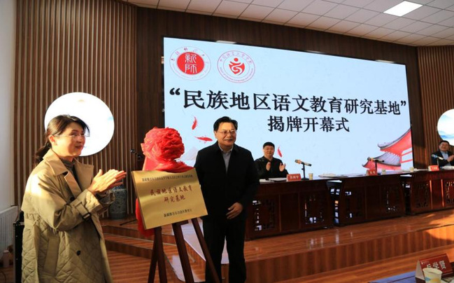 新疆教育科学研究院院长丁志雁,玩滚球的十大正规平台党委常委、宣传部部长高靖为“民族地区语文教育研究基地”揭牌